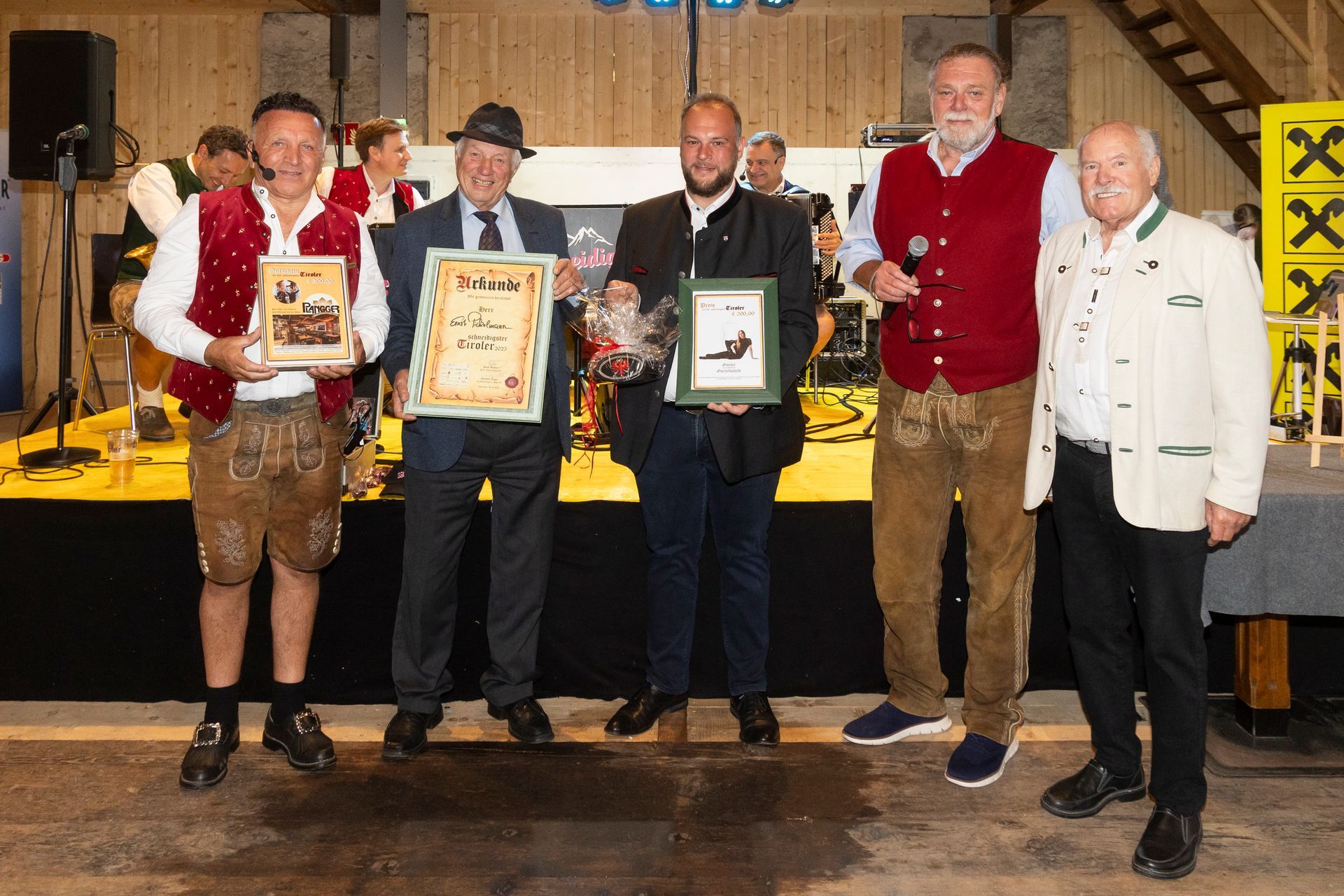 Die Urkunde "schneidigster Tiroler 2025", ein Genussgutschein von PLANGGER Delikatessen im Wert von 200,00 € und ein schönes Gürtelschild mit rotem Adler von Anna Gürtelart im Wert von 200,00 € wurden dem "schneidigsten Tiroler" übergeben.  Wir gratulieren von ganzem Herzen!